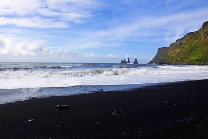 【維克黑沙灘】由海水搬運(yùn)積聚的火山巖碎屑形成,顏色是天然玄黑色,但海水未受影響,依然清澈親切。