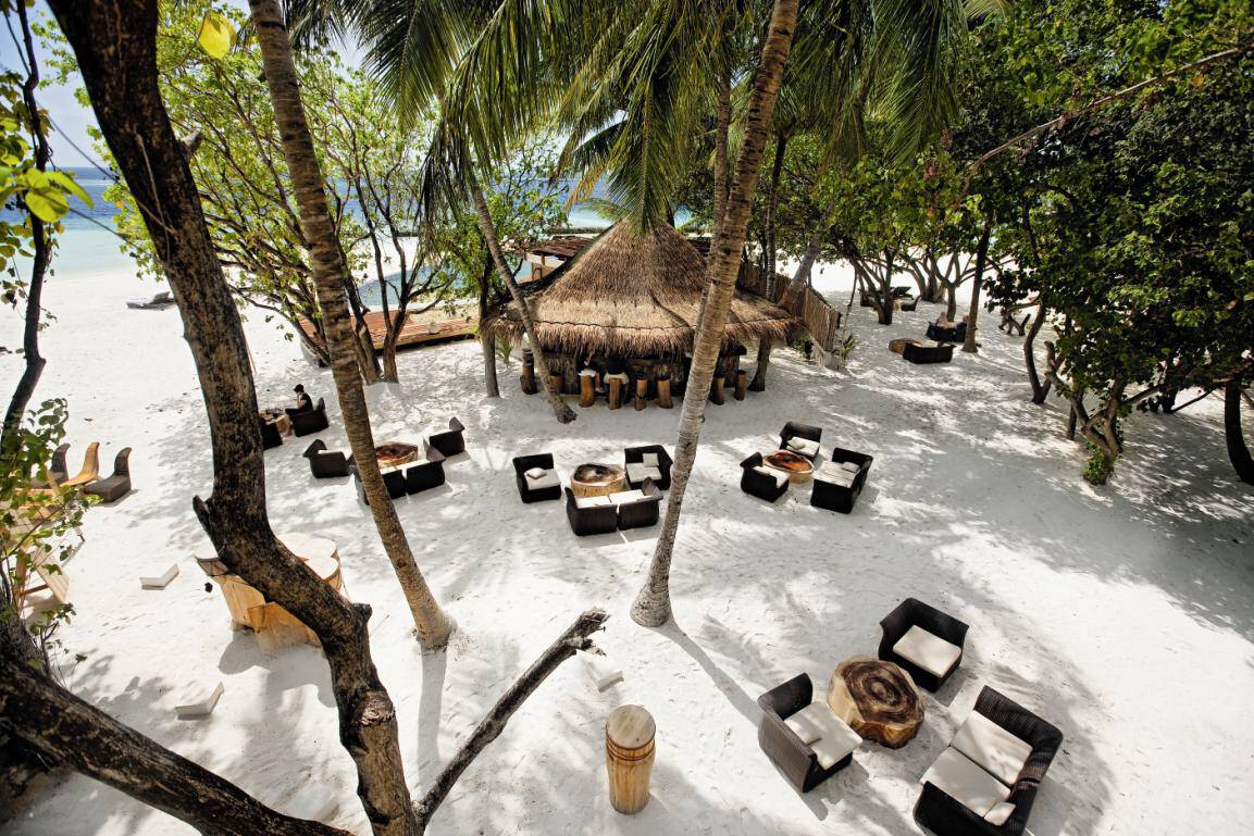 酒吧位于泳池背后的海灘上,在茂密的土著樹(shù)樹(shù)冠下,用民族漂木雕刻裝飾。