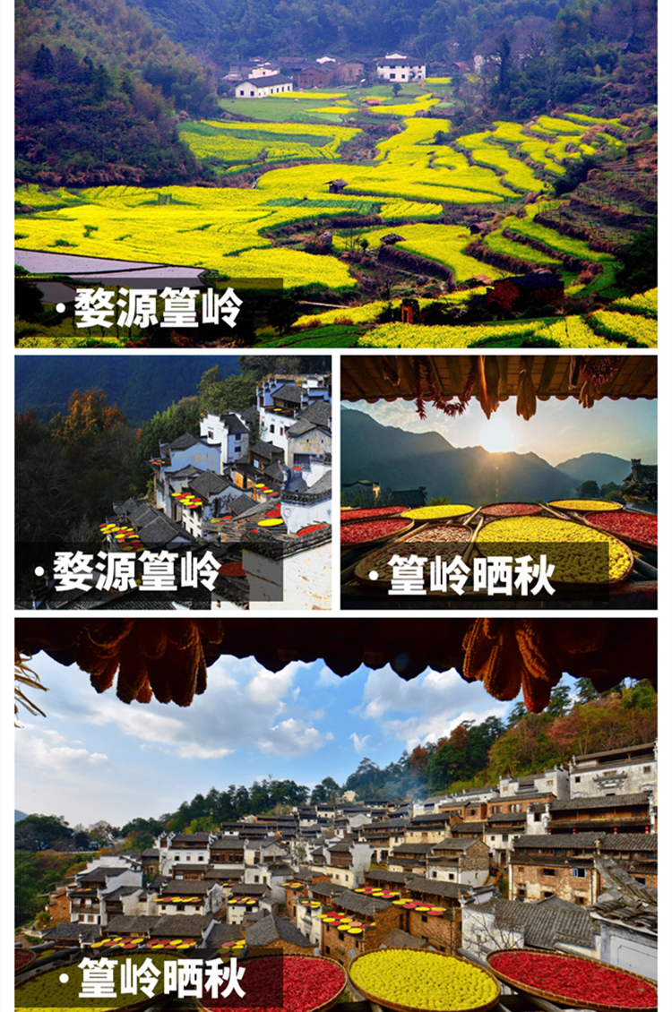 12:00-16:00游覽【篁嶺賞油菜花--婺源山居古村落-篁嶺4A級(jí)景區(qū)(不含往返纜車(chē)120元/人)】(游覽2.5小時(shí))中國(guó)最美沙洲,贈(zèng)送最佳攝影地【月亮灣】,游覽梯云村落.曬秋人家——【篁嶺景區(qū)】有“南方布達(dá)拉宮”之稱(chēng),篁嶺村落“天街九巷”似玉帶將精典古建串接,徽式商鋪林立,前店后坊,仿佛一幅流動(dòng)的縮寫(xiě)版“清明上河圖”。 周邊千畝梯田簇?fù)恚募净êU故倔@艷的“大地藝術(shù)”。 窗銜篁嶺千葉匾,門(mén)聚幽篁萬(wàn)畝田,因“其地多篁竹”得名,嶺高500米,建村500多年;